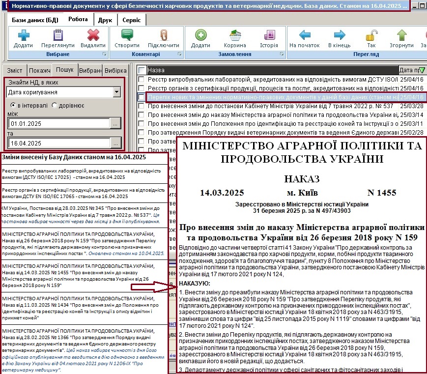 Ця спеціалізована повнотекстова База даних містить документи, що регулюють безпечність харчових продуктів та ветеринарну діяльність в Україні, переліки стандартів; загальні настанови стосовно правил ЄС щодо імпорту та транзиту живих тварин і продуктів тваринного походження; методичні рекомендації щодо застосування законодавства у сфері органічного виробництва, обігу та маркування органічної продукції та інші довідкові матеріали. В БД «Нормативно-правові документи у сфері безпечності харчових продуктів та ветеринарної медицини» тепер внесено документи, щодо дотримання законодавства про харчові продукти, корми, державний ветеринарно-санітарний контроль у період воєнного стану (інформація станом на 25.11.2025 р.). З травня по листопад 2025 року в цій базі даних оновлено Норативно-правові акти; Тематичні переліки бібліографічних описів стандартів; Реєстри органів з сертифікації продукції та випробувальних лабораторій; низку нормативно-правових актів та текстів регламентів та директив ЄВРОПЕЙСЬКОГО ПАРЛАМЕНТУ І РАДИ ЄС, що стосуються безпечності харчових продуктів та ветеринарної діяльності, а також додано такі документи: КМ України, Постанова від 05.11.2025 № 1410 "Про внесення змін до постанови Кабінету Міністрів України від 13 березня 2022 р. № 303"; МІНІСТЕРСТВО ЕКОНОМІКИ, ДОВКІЛЛЯ ТА СІЛЬСЬКОГО ГОСПОДАРСТВА УКРАЇНИ, Наказ від 31.10.2025 № 976 "Про затвердження форми акта, складеного за результатами проведення планового (позапланового) заходу державного контролю (інспектування) стосовно дотримання операторами ринку вимог законодавства про матеріали і предмети, призначені для контакту з харчовими продуктами"; МІНІСТЕРСТВО ЕКОНОМІКИ, ДОВКІЛЛЯ ТА СІЛЬСЬКОГО ГОСПОДАРСТВА УКРАЇНИ, Наказ від 30.10.2025 № 952 "Про внесення змін до наказу Міністерства аграрної політики та продовольства України від 26 березня 2018 року N 158"; МІНІСТЕРСТВО ЕКОНОМІКИ, ДОВКІЛЛЯ ТА СІЛЬСЬКОГО ГОСПОДАРСТВА УКРАЇНИ, Наказ від 17.10.2025 № 789 "Про затвердження Вимог щод простежуваності побічних продуктів тваринного походження"; МІНІСТЕРСТВО ОХОРОНИ ЗДОРОВ'Я УКРАЇНИ, Наказ № 1536 від 08.10.2025 р."Про внесення змін до Мікробіологічних критеріїв для встановлення показників безпечності харчових продуктів"; КМ України, Постанова від 25.09.2025 № 1216 "Про затвердження Порядку встановлення та функціонування карантинних ветеринарних постів та дезінфекційних установок у пунктах пропуску через державний кордон України"; МІНІСТЕРСТВО АГРАРНОЇ ПОЛІТИКИ ТА ПРОДОВОЛЬСТВА УКРАЇНИ, Наказ від 15.07.2025 № 1954 "Про внесення змін до наказу Міністерства аграрної політики та продовольства України від 25 квітня 2022 року № 244"; МІНІСТЕРСТВО АГРАРНОЇ ПОЛІТИКИ ТА ПРОДОВОЛЬСТВА УКРАЇНИ, Наказ від 01.07.2025 № 1910 "Про внесення змін до наказу Міністерства аграрної політики та продовольства України від 13 квітня 2016 року № 157"; МІНІСТЕРСТВО ОХОРОНИ ЗДОРОВ'Я УКРАЇНИ, Наказ № 1018 від 26.06.2025 р. "Про затвердження Державних медико-санітарних правил "Правила поводження з генетично модифікованими організмами при здійсненні генетично-інженерної діяльності в замкненій системі"; МІНІСТЕРСТВО АГРАРНОЇ ПОЛІТИКИ ТА ПРОДОВОЛЬСТВА УКРАЇНИ, Наказ від 05.06.2025 № 1817 "Про затвердження Порядку здійснення операторами ринку періодичних досліджень (випробувань) кормів на предмет вмісту речовин, наявність яких є обмеженою або забороненою"; МІ